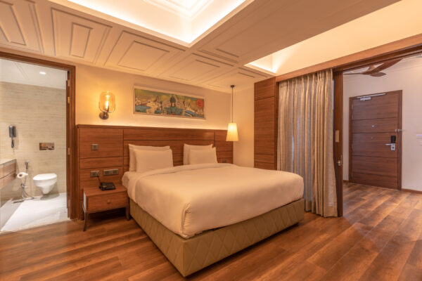 One of its kind in our entire property. This room category has a bedroom and an adjoining living room. The bedroom has a King size bed and the living room has a double sofa cum bed to relax after a day of fun activity.